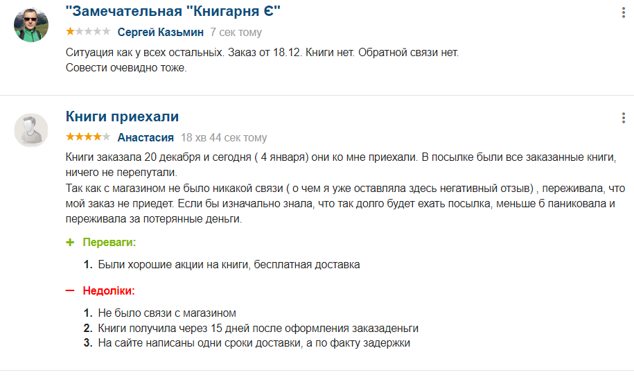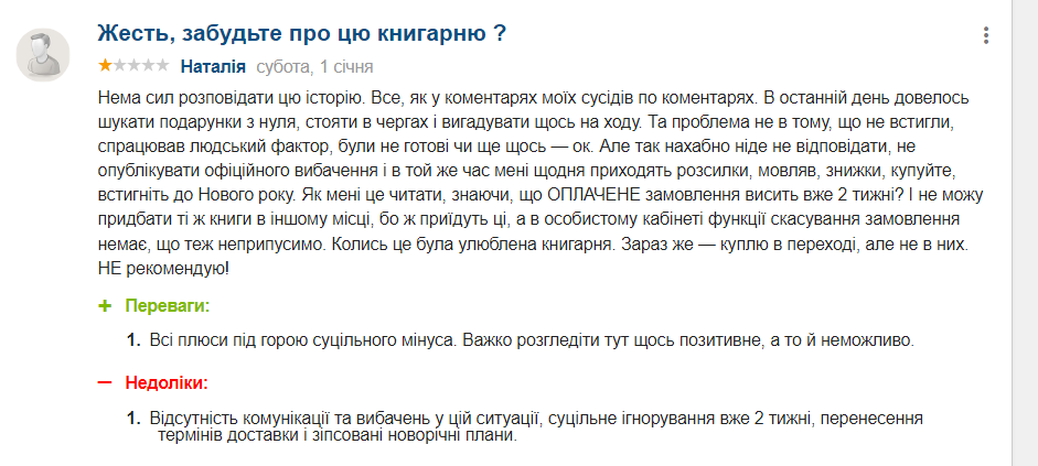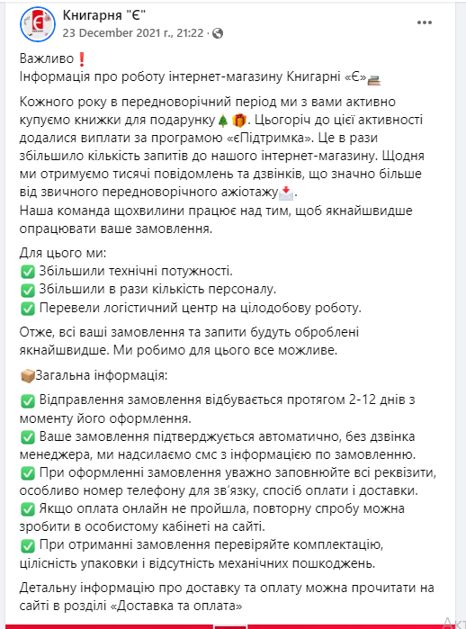 23 декабря в своем Facebook представители компании заявили, что в предновогодний период могут быть задержки с отправкой заказов - до 12 дней. В этот период всегда много желающих приобрести книги, а в этом году ситуация усугубилась из-за выплат єПідтримки. Но пообещали, что постараются сделать все вовремя и для этого увеличили количество персонала и технические возможности предприятия.