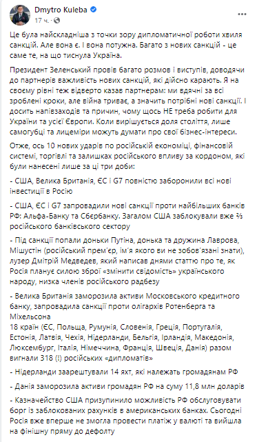 «Казначейство США приостановило возможность РФ обслуживать долг с заблокированных счетов в американских банках. Россия уже не смогла провести платеж в валюте и приближается к дефолту. Также США применят полную блокировку к ряду самых больших госпредприятий РФ. Помимо этого, будет введен запрет на импорт российского угля на сумму 4 млрд евро в год, полный запрет транзакций для 4 российских банков, запрет российским суднам заходить в порты ЕС», - написал Дмитрий Кулеба.