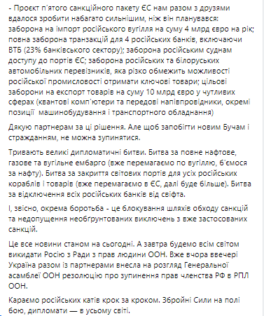 «Продолжаются большие дипломатические битвы. Битва за полное нефтяное, газовое, угольное эмбарго, за закрытие мировых портов для всех российских кораблей и товаров. Битва за полное отключение всех банков от свифта», - написал Дмитрий Кулеба.