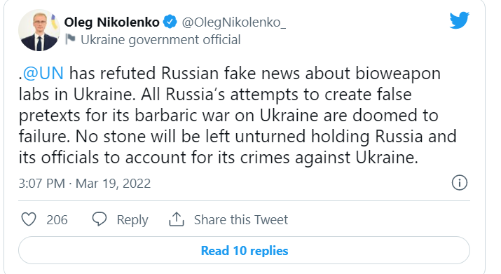 "ООН опровергла российские фейковые новости о лабораториях биологического оружия в Украине. Все попытки россии создать лживые поводы своей варварской войны с Украиной обречены на провал", - написал он.