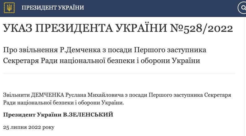 Звільнити Демченка Руслана Михайловича з посади першого заступника секретаря Ради національної безпеки і оборони України, - йдеться в документі.