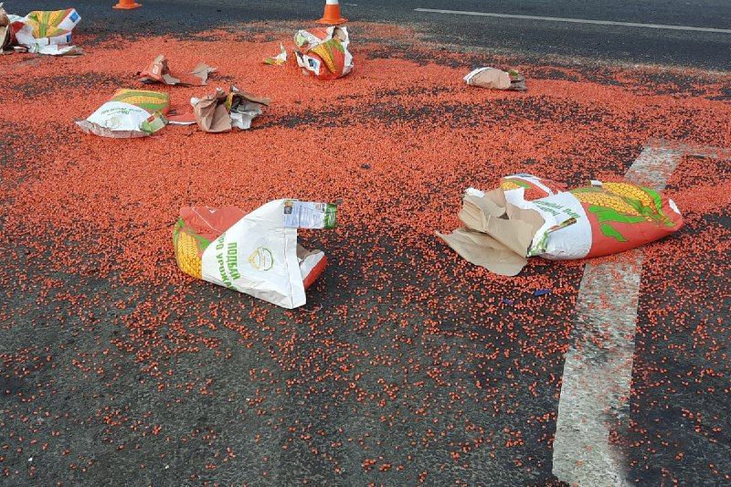 Этот челлендж продолжается: на трассе рядом с пгт Мелиоративное столкнулись Kia Sportage и ВАЗ, из прицепа которого на асфальт высыпалось кукурузное зерно.