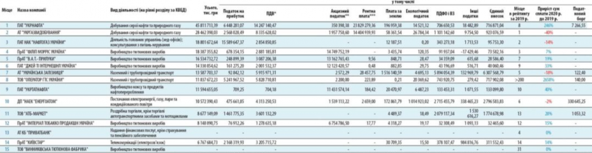 На первом месте в рейтинге налогоплательщиков находится крупнейшая нефте- и газодобывающая украинская компания «Укрнафта». Компания увеличила сумму налоговых выплат на 246 % по сравнению с прошлым годом. Второе и третье места заняли «Укргазвидобування» і «Нафтогаз України».