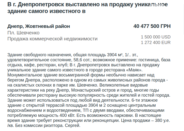 1,5 млн долларов: в Днепре продают здание легендарного "Маяка"