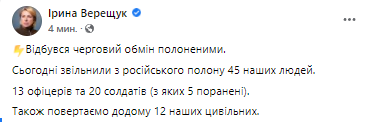 Сегодня освободили из плена 45 наших военнопленных. Также домой вернуться 12 наших гражданских.