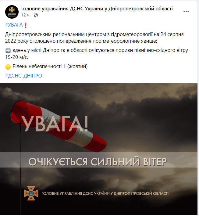 Синоптики Днепропетровского регионального центра по гидрометеорологии на сегодня, 24 августа, объявили предупреждение о метеорологическом явлении: днем в городе Днепр и в области ожидаются порывы северо-восточного ветра 15-20 м/с.