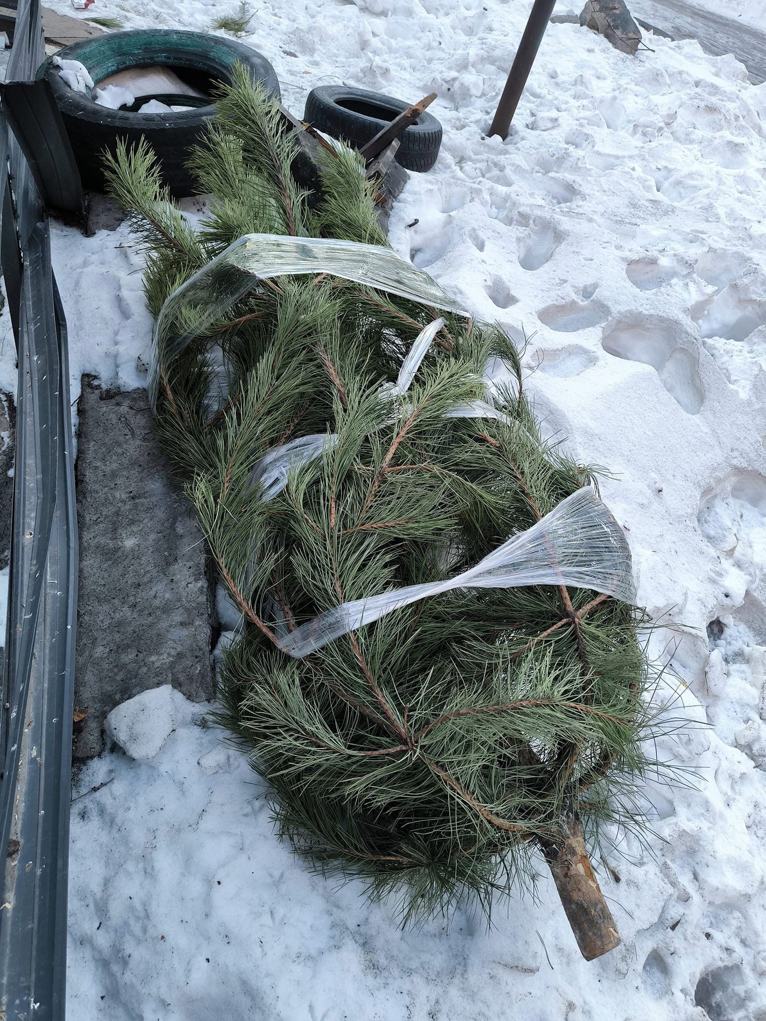 Теперь деревце лежит возле мусорки. Стоит заметить, что сосна выглядит достаточно свежей, поэтому, вероятно, ее приобрели за несколько дней до Нового года. Таким образом, елка простояла меньше месяца.