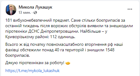 "Всего же с начала полномасштабного вторжения россии наши специалисты обследовали более 40 га территорий и уничтожили 1548 боеприпасов.