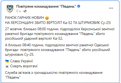 27 октября, около 08:00, подразделением Херсонской зенитной ракетной бригады воздушного командования “Південь” сбит российский ударный вертолет Ка-52. А около 08:40 подразделением зенитной ракетной Одесской бригады воздушного командования “Південь” сбит российский штурмовик Су-25. Слава Украине! Смерть врагам! – говорится в сообщении военных.