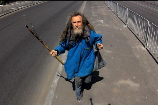 Увидев один раз Сашу невозможно не запомнить - у него длинные седые волосы в колтунах, одет он в грязную одежду, а в руках обязательно держит палку, а иногда и пакет.