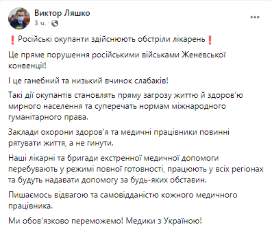 Министр здравоохранения Украины Виктор Ляшко заявил, что вооруженные формирования РФ нарушая Женевскую конвенцию, обстреливают украинские больницы.