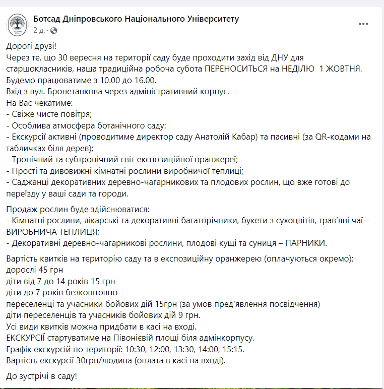 В воскресенье, 1 октября, ботанический сад ДНУ будет принимать гостей. Время работы с 10:00 до 16:00.