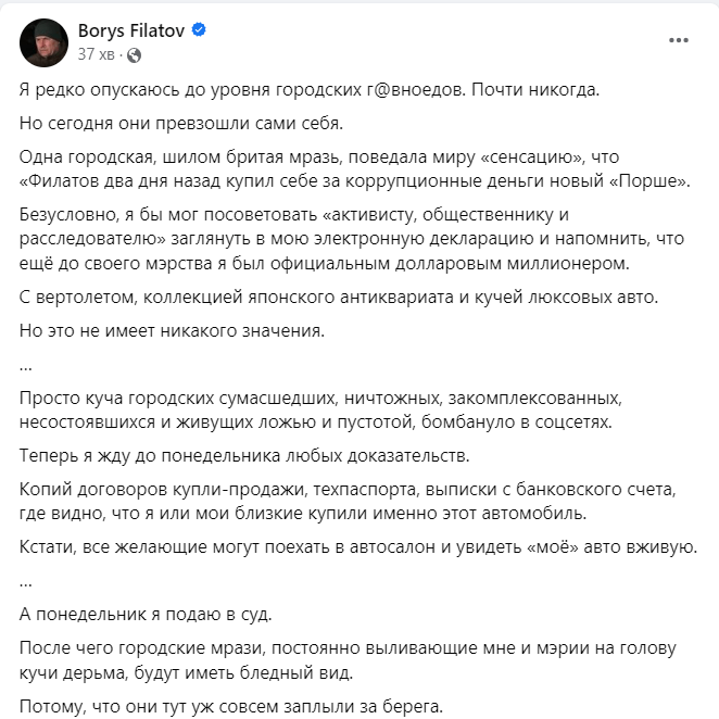 Ранее в соцсетях появилась публикация активиста Дениса Селина о приобретении городским головой Днепра Борисом Филатовым эксклюзивной модели Porsche за более 5,5 млн грн. Не успела она повисеть и часа в Facebook, как Селин ее убрал. Случилось это сразу после того, как Борис Филатов ответил активисту на обвинения, заявив, что подаст на это в суд за клевету.
