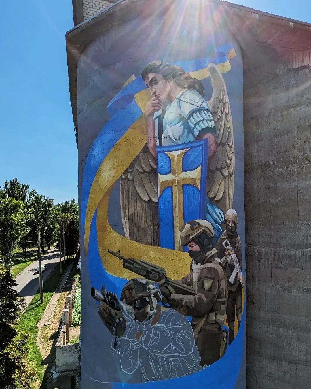 На мурале изображены военные, которых оберегает ангел-хранитель.