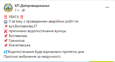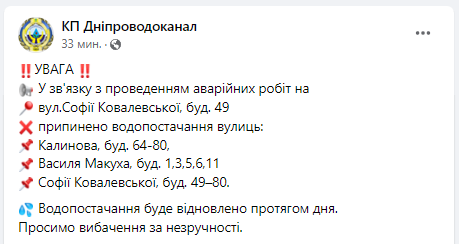 Аварійні роботи: де сьогодні у Дніпрі не буде води
