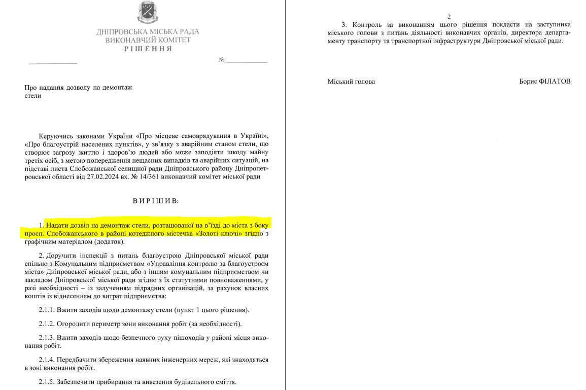 В связи с аварийным состоянием стелы, что создает угрозу жизни и здоровью людей или может причинить школу имуществу третьих лиц, с целью предотвратить несчастные случаи и аварийные ситуации исполнительный комитет городского совета решил предоставить разрешение на демонтаж стелы, - говорится в документе.