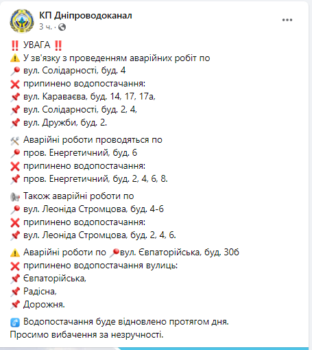 Об этом сообщает КП "Днепрводоканал".