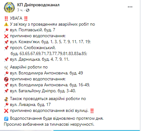Так, в связи с проведением аварийных работ по ул. Полтавской, 7; ул. Владимира Антоновича, 49; ул. Литейной, 17 прекращено водоснабжение: