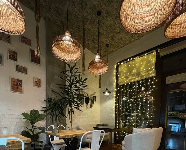 Интерьер заведения оформлен в легких, светлых и приятных тонах, а «восточность» ресторана подчеркивает деревянная мебель и плетеные абажуры для ламп на потолке.