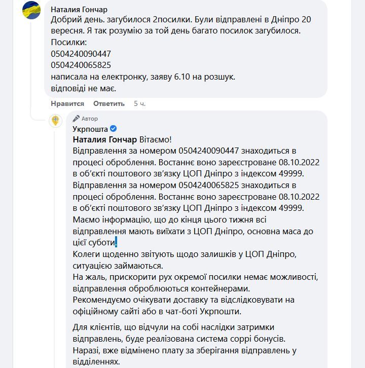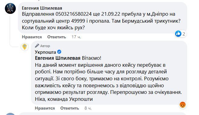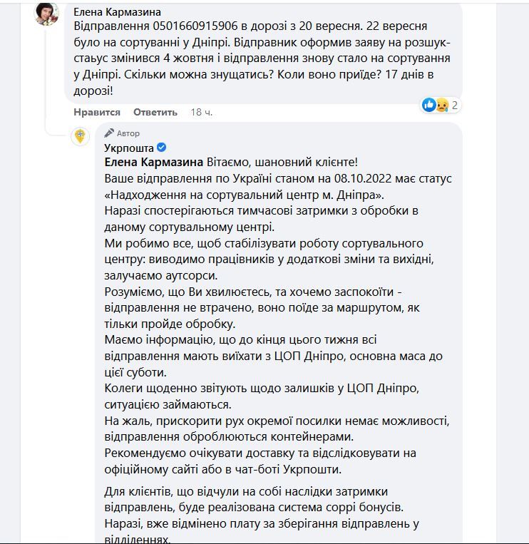 Следует отметить, что представители Укрпочты отвечают на каждое обращение и признают, что с сортировочным центром в Днепре есть проблемы. По их словам, такие задержки происходят из-за большого объема отправлений и недостаточного количества сотрудников.
