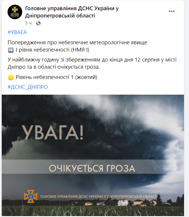 Так, синоптики прогнозируют в ближайший час с сохранением до конца дня 12 августа в Днепре и области грозу. Уровень опасности 1 (желтый).