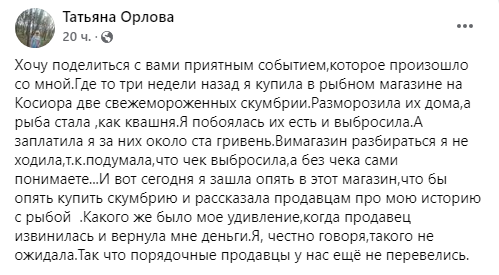 В последнее время много информации о нечестных продавцах, но в этом случае все наоборот. Так, в Днепре продавец рыбы с извинениями вернула покупателю деньги за некачественный товар. И все это - через 3 недели, и без предъявления чека. Историю о честном продавце рассказала днепрянка в фейсбук-группе Райончик.