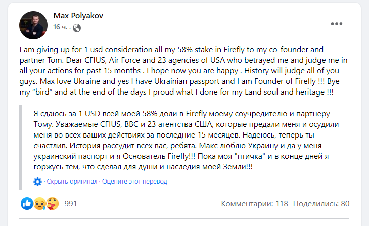 Свою долю в компании он продал сооснователю Firefly Aerospace за символический 1 доллар США. Поляков владел 58% акций. Также он отметил, что у него украинский паспорт и он любит Украину.
