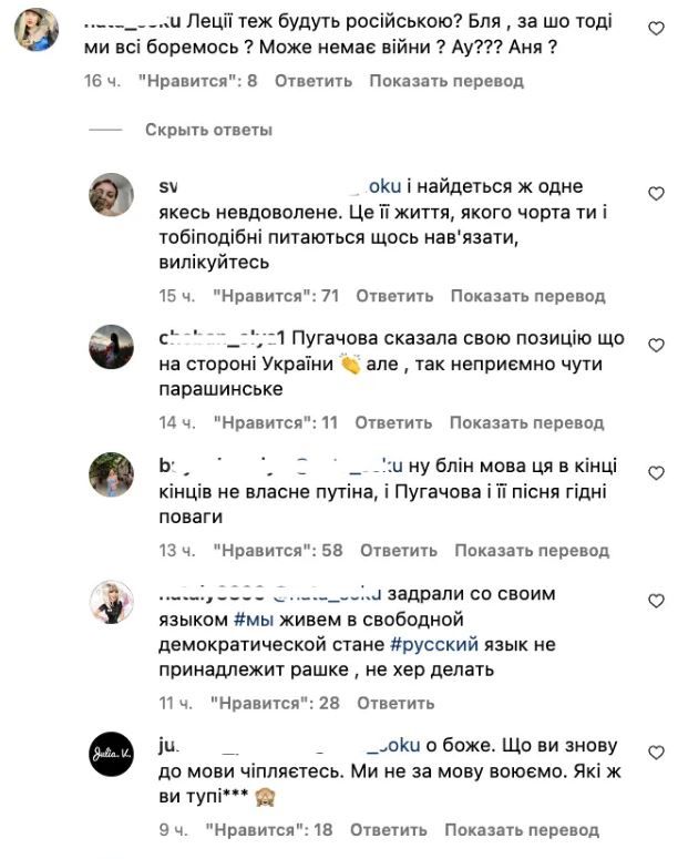 Несмотря на возмущение части аудитории, остальные фолловеры Анны не увидели в этом ничего криминального. Такое свое убеждение украинцы аргументируют тем, что Пугачева уехала из России и не поддержала войну. Также, по мнению некоторых комментаторов, мы живем в свободной стране, а Путин не присвоил себе русский язык, поэтому люди могут на нем свободно говорить.