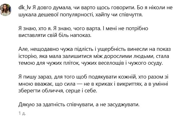 "Я долго думала, стоит ли что-то говорить. Потому что я никогда не искала дешевой популярности, хайпа или сострадания. Я знаю, кто я. Я знаю, чего стоит. И мне не нужно выставлять свою боль напоказ. Но, недавно чужая подлость и ущербность вынесли на показ историю, которая должна была остаться между взрослыми и чужими. шу сейчас для того, чтобы поблагодарить каждого, кто вместе со мной считает, что сила — не в криках и разоблачениях, а в умении сохранить лицо, сердце и себя", - написала Дарья.