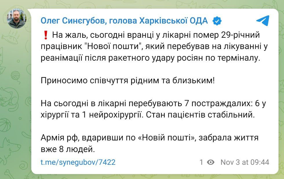 К сожалению, сегодня утром в больнице умер 29-летний работник "Новой почты", который пострадал после ракетного удара россиян по терминалу в Харьковской области.