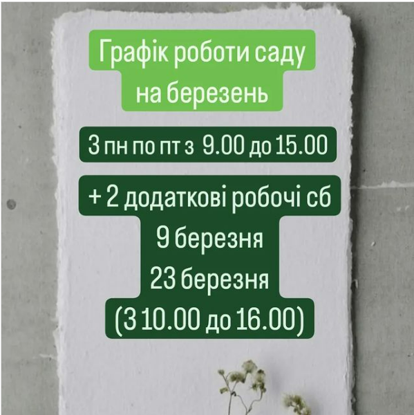 В марте ботсад будет работать с понедельника по пятницу с 9:00 до 15:00. Кроме того, будут дополнительные рабочие субботы - 9 и 23 марта (в эти дни сад будет работать с 10:00 до 16:00).