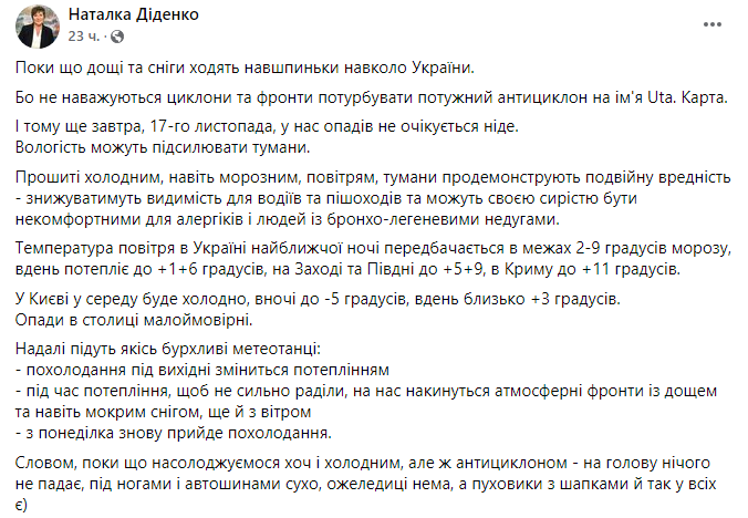 С 18 ноября в Украину зайдет западный циклон, поэтому погода изменится. На смену холодам придет небольшое тепло, но станет больше облаков, осадков в виде мороси и мокрого снега. В выходные же будет ветрено, порывы ветра местами будут достигать 15-20 м/с.