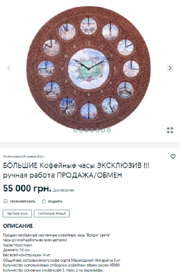 Необычные часы из зерен кофе обойдутся в 55 тыс грн. Называются они «Вокруг света», сделаны вручную. На часах 13 циферблатов. Самый большой – показывает украинское время, остальные – время разных стран. Корпус часов выложен из кофе. Продавец сообщает, что на их отделку пошло 45 тыс кофейных зерен или 5 кг этого бодрящего напитка. Часы покрыты лаком. Вес изделия – 14 кг. Работают от двух батареек.