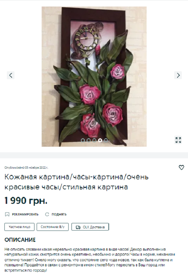 Купить картину из кожи можно за 1,9 тыс грн. На картине «изображены» цветы и установлены часы. Последние вполне обычные, а вот каждый листик и соцветие в цветах вырезаны из натуральной кожи.