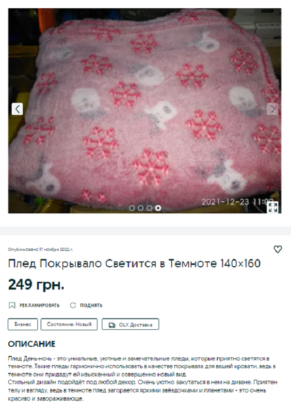 Покрывало, светящееся в темноте, продают в Интернете за 250 грн. Точный механизм «работы» такого пледа не описан продавцом, известно, что, когда в комнате становится темно, на покрывале начинают светиться звезды и планеты. «Заряжают» покрывало посредством обычного света или солнца.