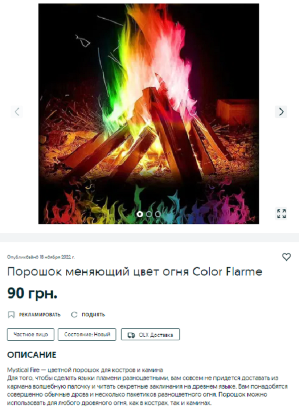 Щепотку порошка, который меняет цвет костра можно приобрести за 90 грн. 25 грамм химической смеси «перекрасят» огонь в зеленый, розовый, синий или голубой цвет. Главное условие – костер должен быть дровяным. Одной порции хватает на час горения.