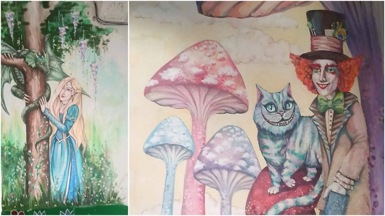 На стенописях изображены Чеширский кот и Упорный Шляпник, которые загадочно улыбаются всем проходящим мимо. На одной из стен изображена девушка, которая общается со сказочным драконом.