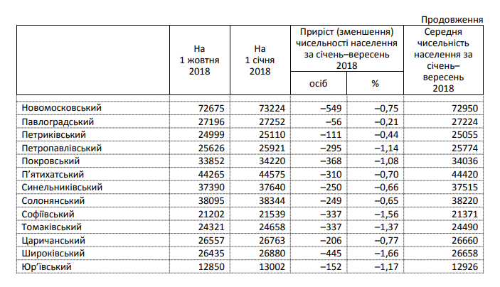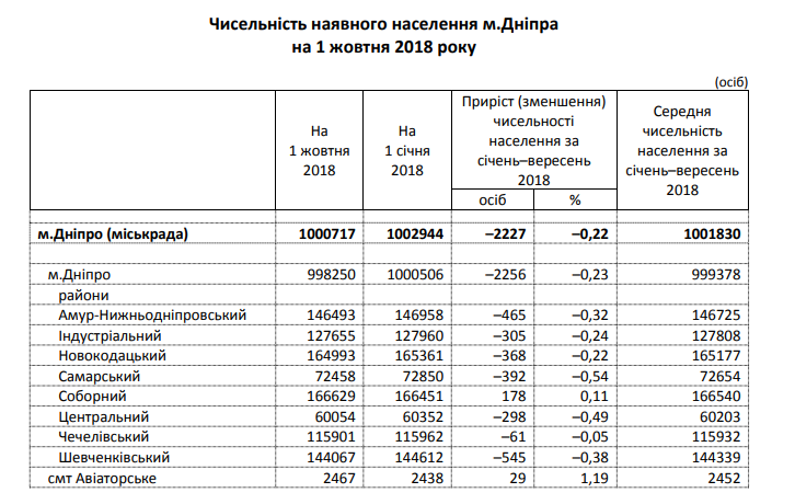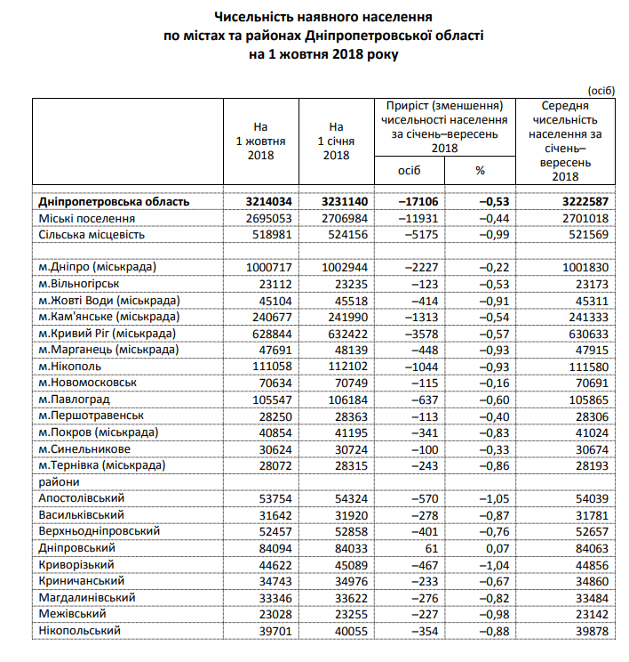 По информации Главного управления статистики в Днепропетровской области численность населения региона на 1 октября 2018 года составила 3 миллиона 214 тысяч 34 человека.
