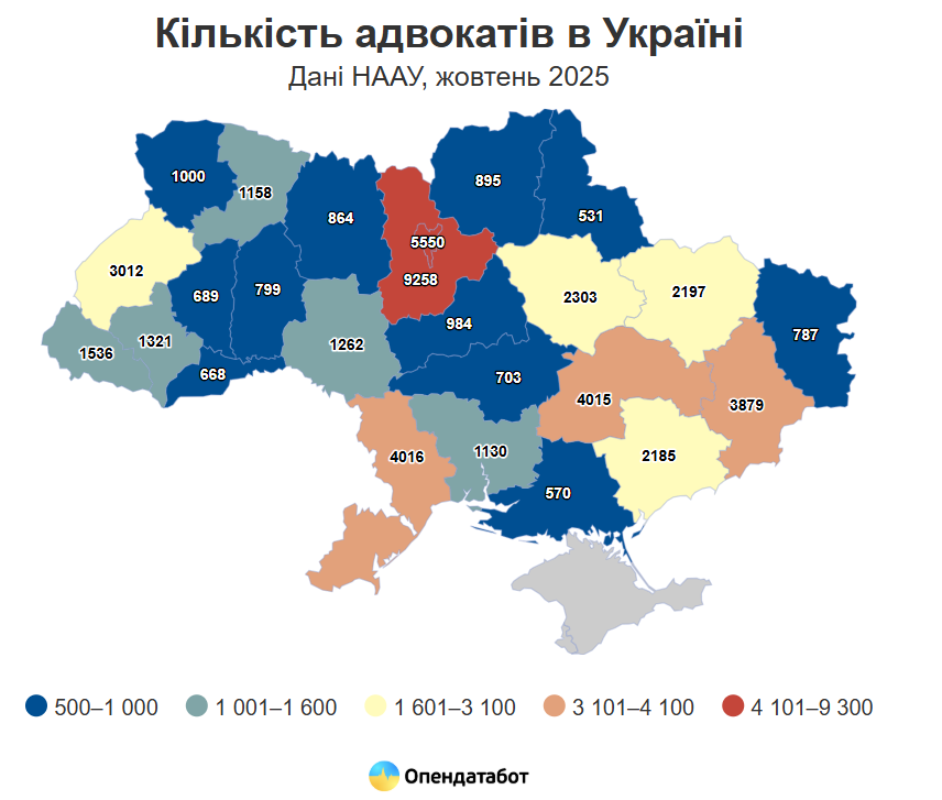 Сейчас больше всего адвокатов зарегистрировано в Киевской области: 9 258 или 18%, в столице - 5 550 или 11%. Третье место по запросу специалистов адвокатуры поделили Одесщина (4 016) и Днепропетровщина (4 015). Сейчас профессия остается преимущественно мужской – 59% адвокатов в реестре.