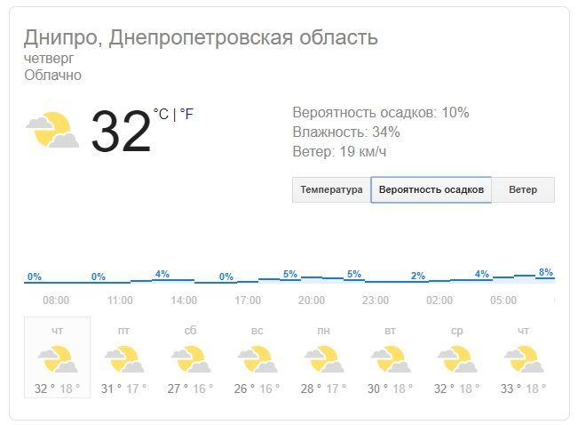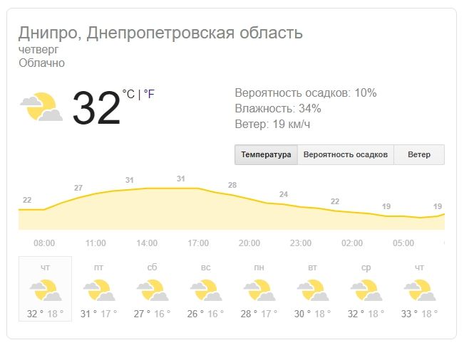 По прогнозу синоптиков, ближайшие 5 дней в Днепре температура воздуха продержится в пределах  26 — 31 градус, ночью - 16 - 18 градусов.