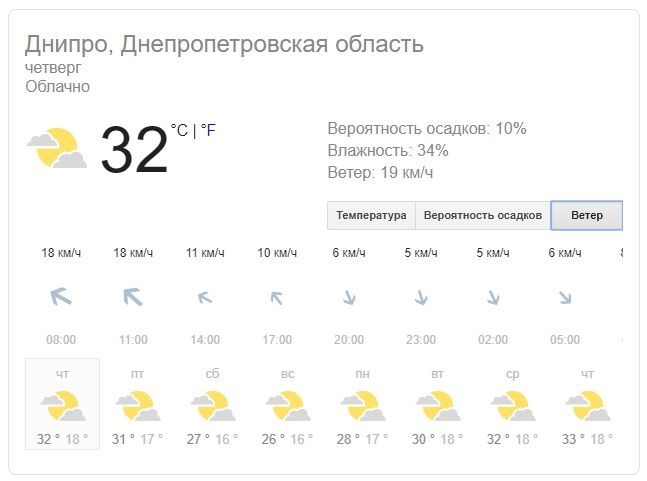 Утром небо в Днепре покрылось облаками, которые продержатся до конца дня.  Днем столбик термометра покажет 31 — 32 градуса. Температура воздуха ночью — 19 — 22 градуса. Ветер юго-восточный, 7-12 м/с. Без осадков.