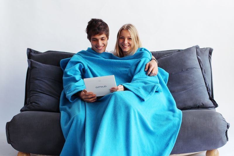 - Плед с рукавами из флиса или микрофибры (от 700 грн). Этот плед с вместительным карманом для книги, пульта, телефона и удобными широкими руквами согрет вашего парня в холодные вечера и даст возможность выполнять ежедневные бытовые задачи с комфортом и в тепле. Стандартный размер изделия – 190*140. Модель для двоих будет стоить от 1200 грн.