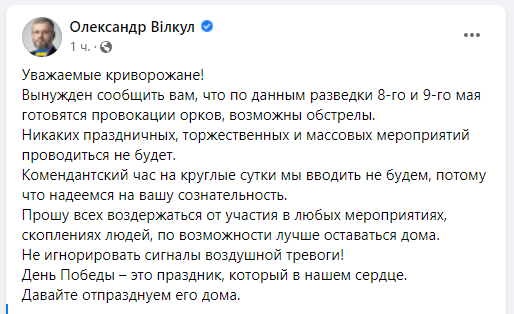 Вынужден сообщить вам, что по данным разведки 8-го и 9-го мая готовятся провокации орков, возможны обстрелы. Никаких праздничных, торжественных и массовых мероприятий проводиться не будет. Комендантский час на круглые сутки мы вводить не будем, потому что надеемся на вашу сознательность.