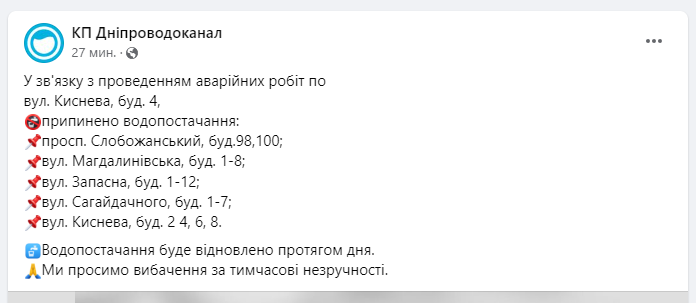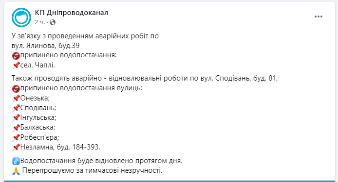 Даже в воскресенье: где сегодня в Днепре нет воды и почему