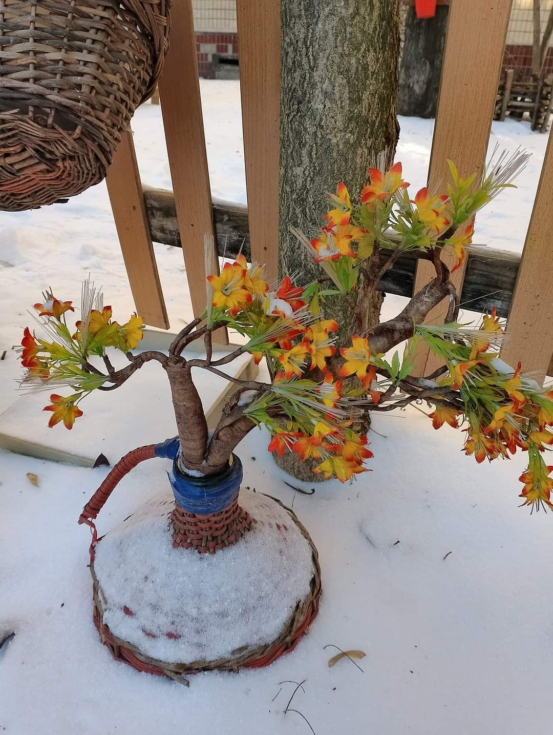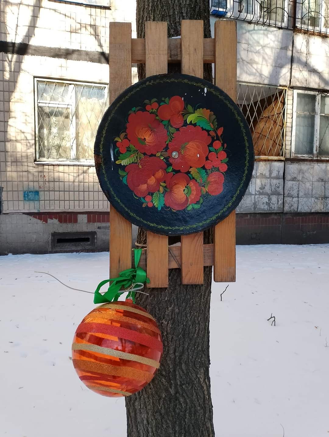 Кроме дерева, на территории дворика есть украинский плетеный плетень, украшенный разрисованными баночками, забор с тарелками в петриковском стиле и еще несколько милых атрибутов.