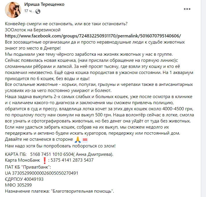 В одном из аквариумов находится шесть кошек, у которых нет доступа ни к воде, ни к еде. В магазине продаются также попугали, хорьки и остальные мелкие зверьки, которые живут в ужасных условиях. Они умирают, так и не дождавшись новых хозяев. По словам волонтеров, владелица на замечание покупателей реагирует агрессивно. За кошек она просит от одной до трех тысяч гривен.