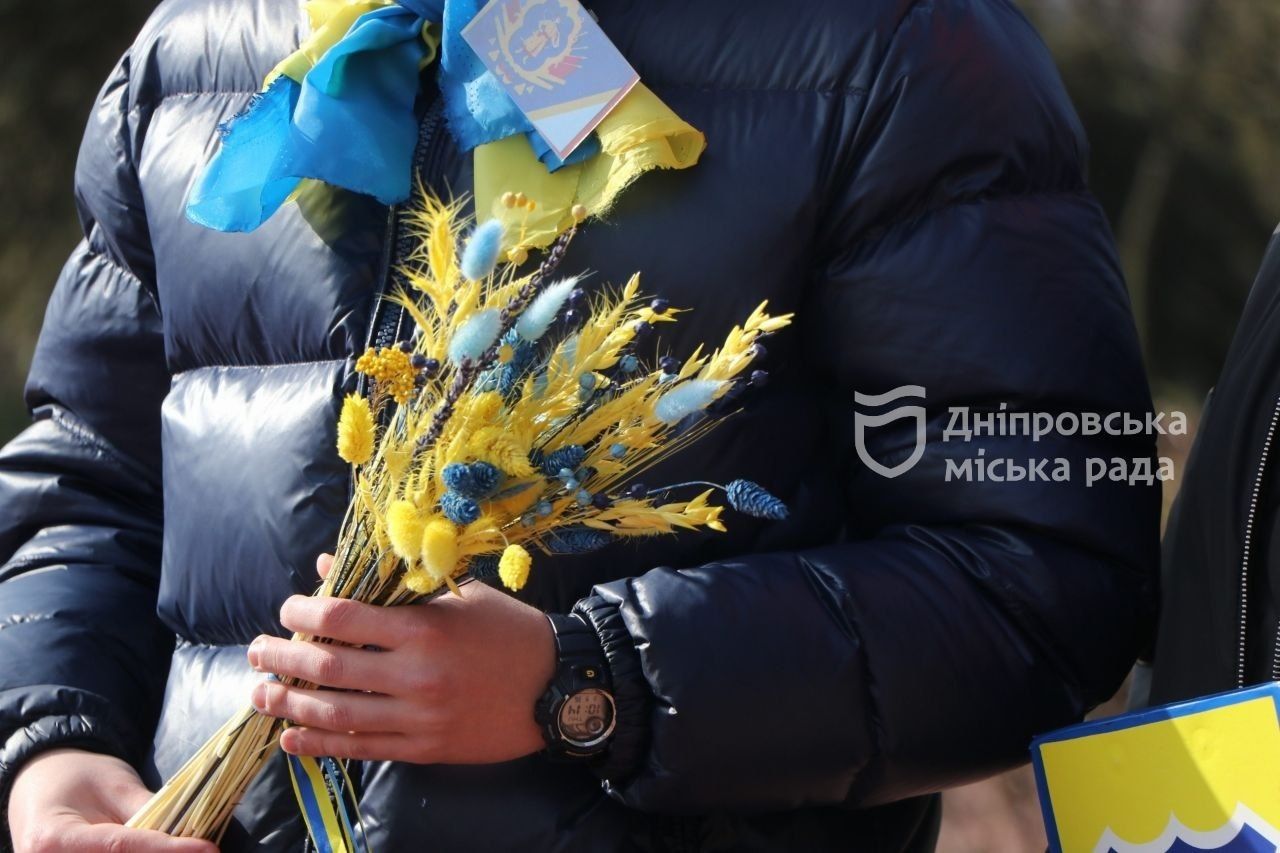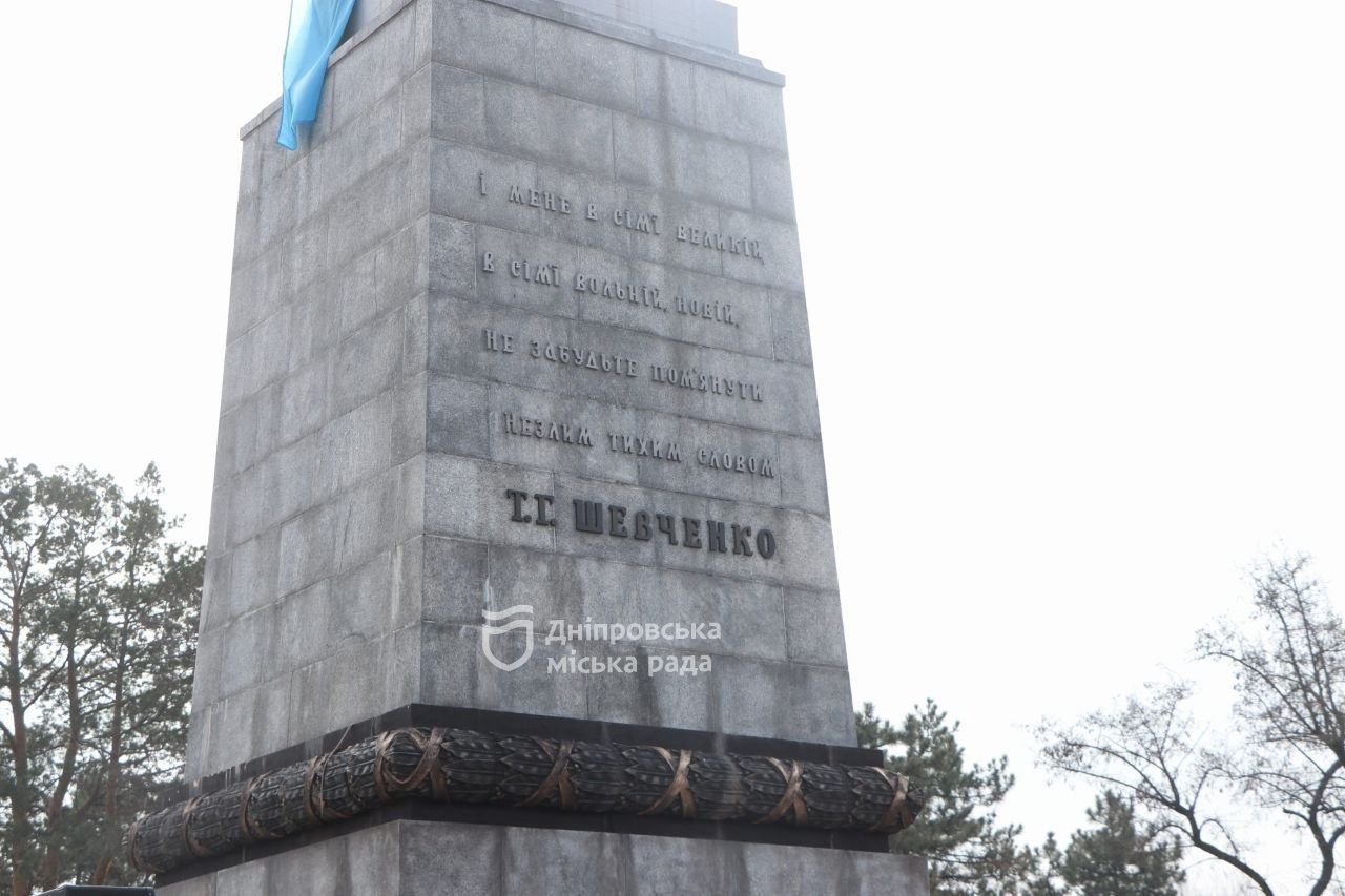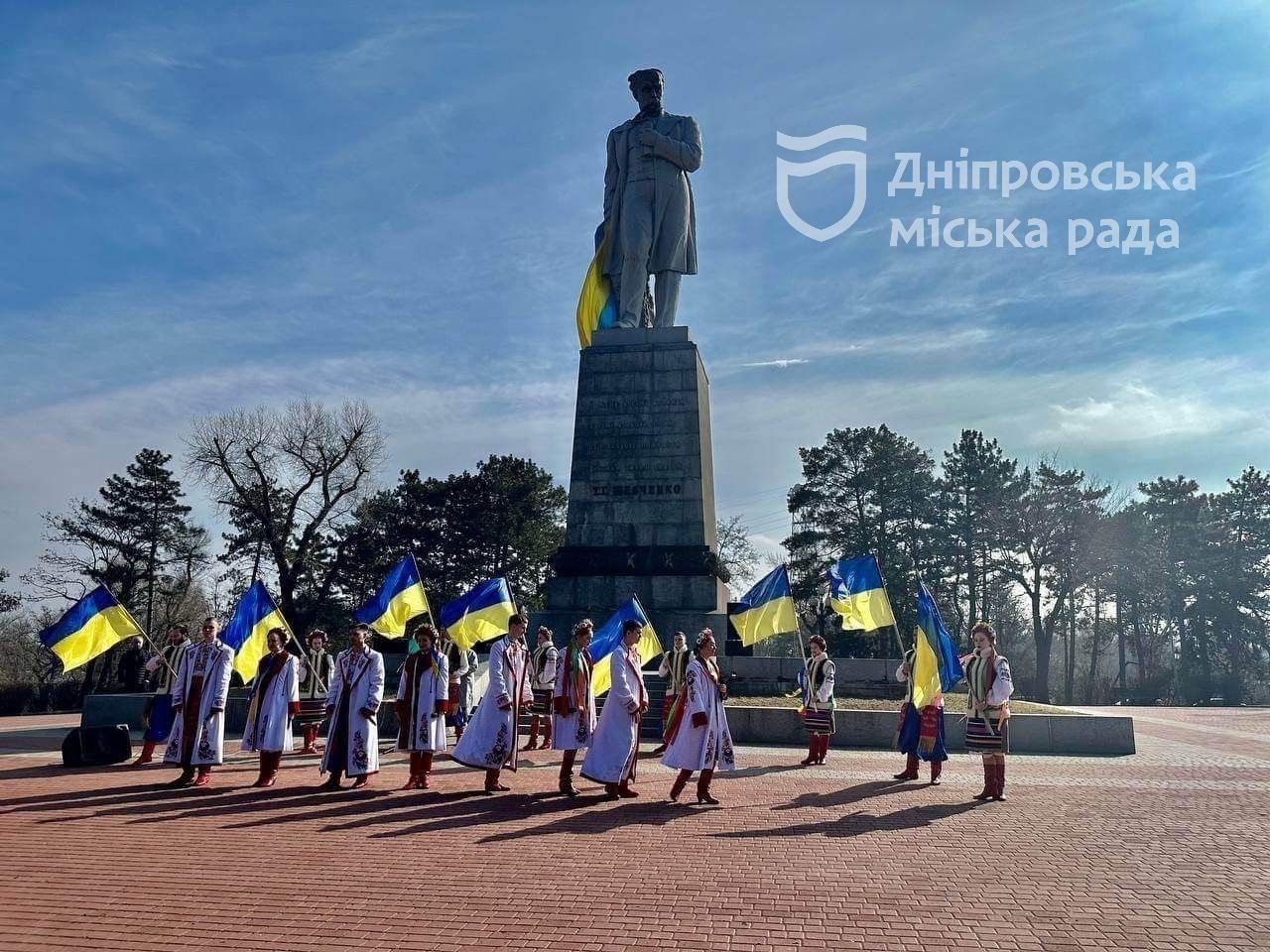 Сегодня в Днепре в парке им. Шевченко ко дню рождения Кобзаря организовали культурно-патриотическое мероприятие. По этому случаю памятник Тарасу Шевченко украсили большим флагом Украины.