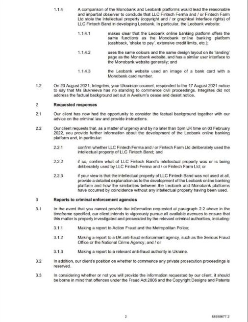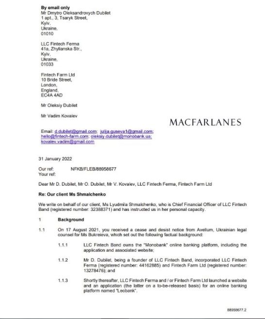 Дмитрий Дубилет и его компании ООО "Финтех Ферма" (Украина), Fintech Farm (Лондон) получили официальное уведомление от британских адвокатов ООО "Fintech Band" (владельца "Монобанка") о подозрении в хищении интеллектуальной собственности.