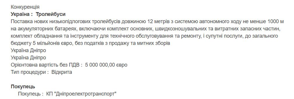 “Поставка новых низкопольных троллейбусов длиной 12 метров с системой автономного хода не менее 1000 м на аккумуляторных батареях, включая комплект основных, быстроизнашивающихся и расходных запасных частей, комплект оборудования и инструмента для технического обслуживания и ремонта и сопутствующие услуги в общий бюджет 5 миллионов евро , без налогов с продаж и таможенных сборов”, - говорится в объявлении.