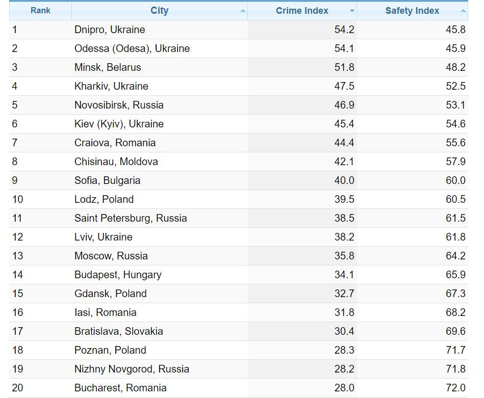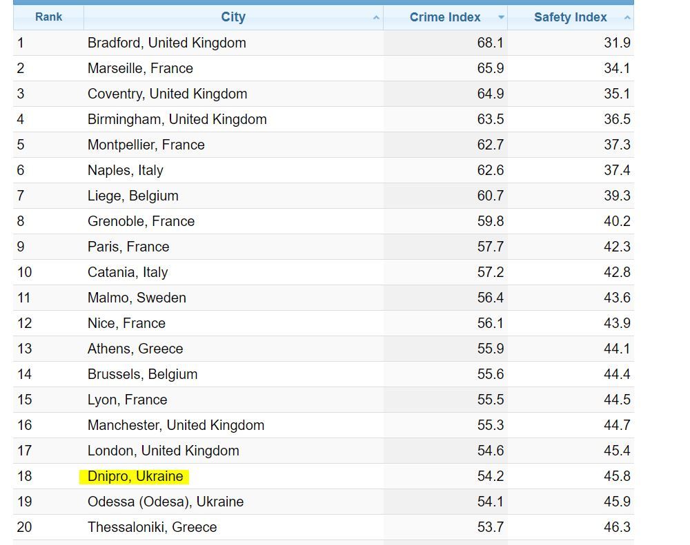 Днепр входит в двадцатку самых криминальных городов в Европе с индексом преступности – 54.2 и безопасности – 45,8. В ТОП-20 среди городов Украины попала только Одесса, которая находится в рейтинге на одну строчку ниже.